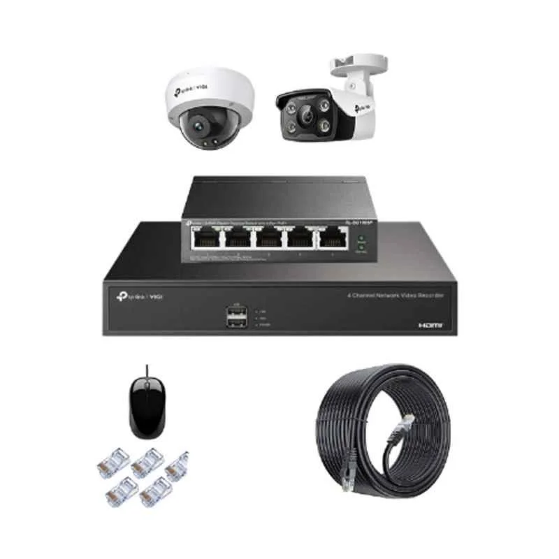 TP-Link VIGI C230 & VIGI C330 1 Unit Each, 1 Unit 4 Channel NVR1004H Including Mouse, 1 Unit 5 Port POE Switch TL-SG1005P, 100 Meters D-LINK LAN Cable & Required Conectors